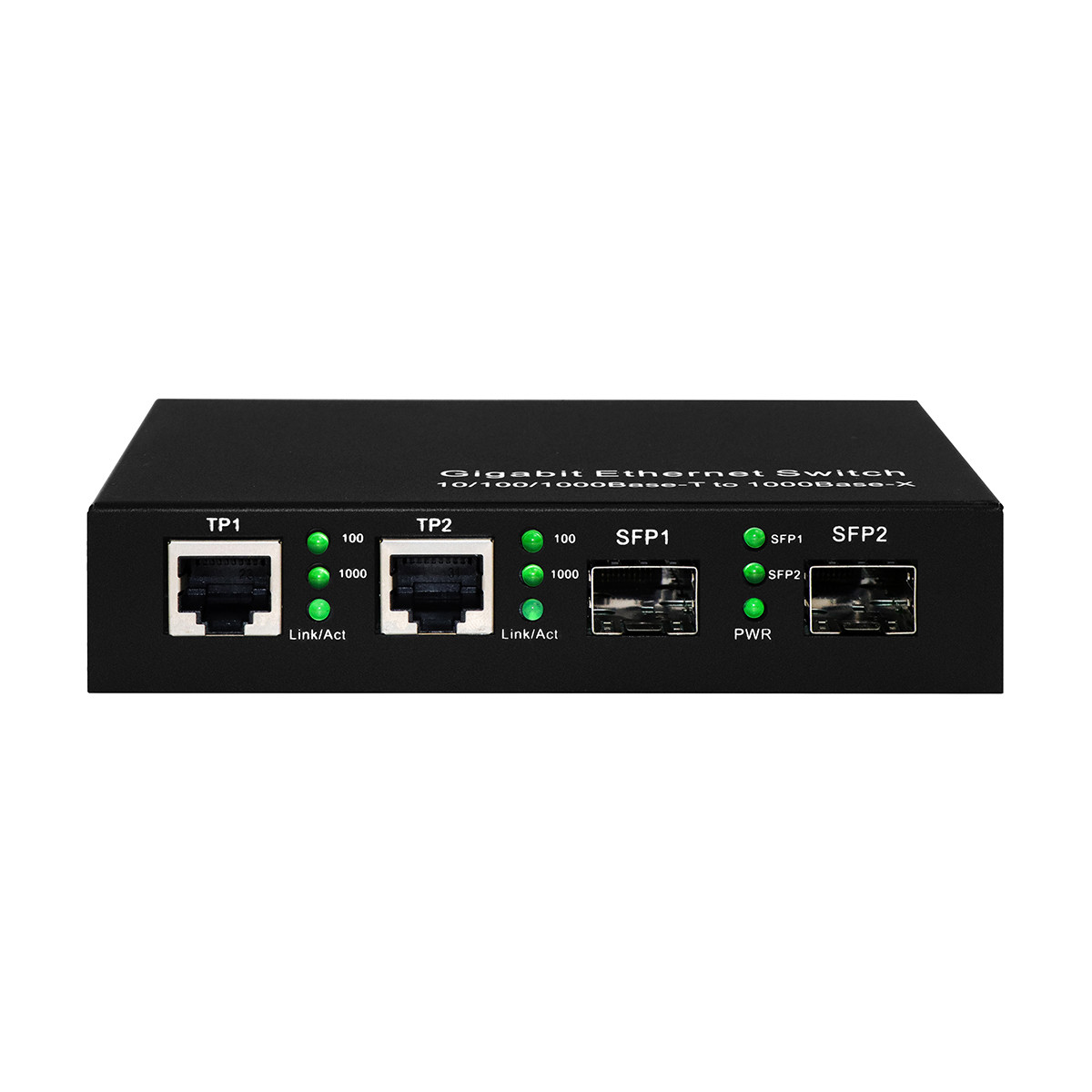 Indicadores LED: TP 100, TP 1000, TP Enlace/Act, SFP1, SFP2, PWR